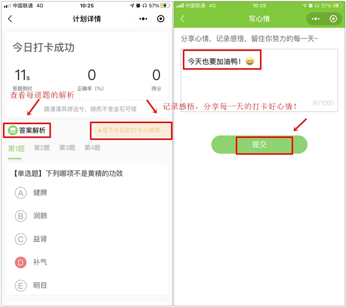 (3)查看測試結(jié)果+答案解析+分享今日打卡心情,提交完成打卡