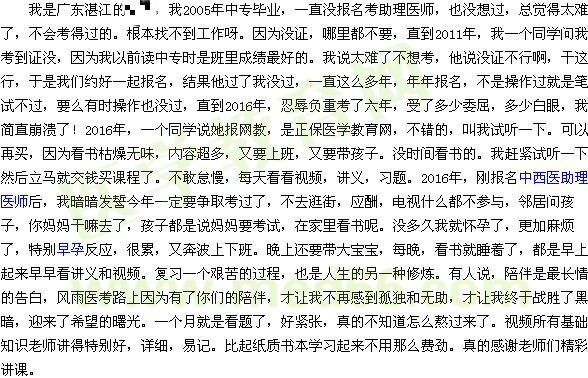 2016年我的醫(yī)考之路大型有獎?wù)魑幕顒踊馃徇M(jìn)行中,醫(yī)學(xué)教育網(wǎng)學(xué)員積極參與,為我們帶來了很多精彩的文章,網(wǎng)校學(xué)員根據(jù)自己參加中西醫(yī)助理醫(yī)師考試的經(jīng)歷,寫了這篇:《我的醫(yī)考路》,讓我們一起來見證他的醫(yī)考之路吧!