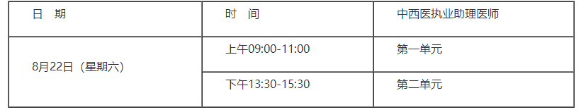 2020年中西醫(yī)助理醫(yī)師醫(yī)學(xué)綜合筆試全國統(tǒng)一考試時間為8月22日,全國實行計算機化考試,具體考試時間安排如下: