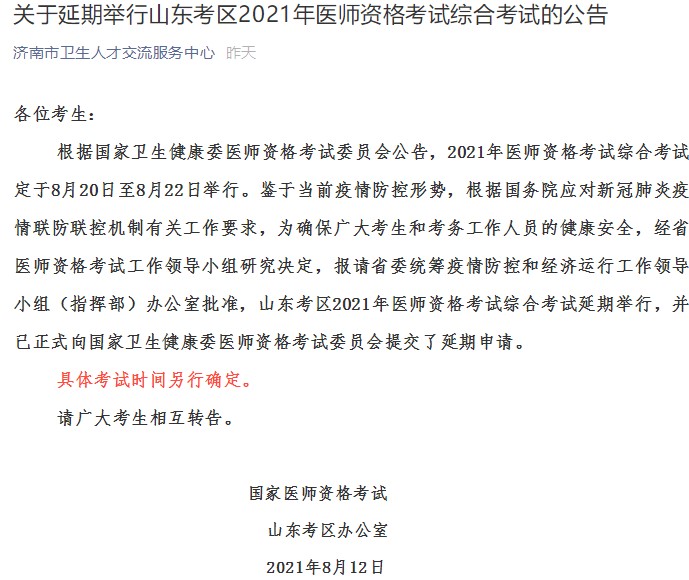 關(guān)于延期舉行山東考區(qū)2021年醫(yī)師資格考試綜合考試的公告
