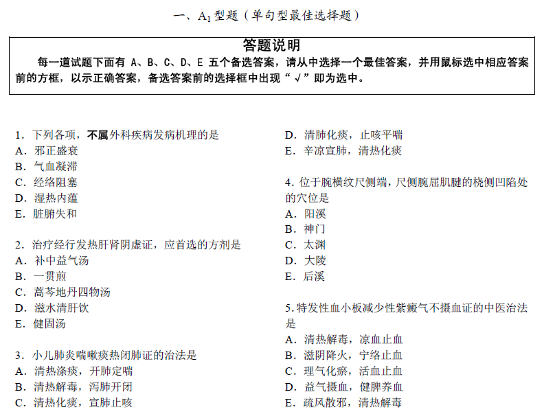 中醫(yī)、中西醫(yī)結(jié)合醫(yī)師資格醫(yī)學(xué)綜合考試全部采用選擇題形式。各類選擇題均由題干和選項兩部分組成。題干是試題的主體,可由一段短語、問句或不完全的陳述句組成,也可由一段病例或圖表、照片及其他臨床資料來表示;選項由可供選擇的詞組或短句組成,也稱備選答案。