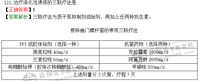 【答案解析】四聯(lián)療法為質(zhì)子泵抑制劑與鉍劑合用,再加上任兩種抗生素。