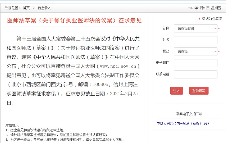 第十三屆全國(guó)人大常委會(huì)第二十五次會(huì)議對(duì)《中華人民共和國(guó)醫(yī)師法(草案)》(關(guān)于修訂執(zhí)業(yè)醫(yī)師法的議案)進(jìn)行了審議。現(xiàn)將《中華人民共和國(guó)醫(yī)師法(草案)》在中國(guó)人大網(wǎng)公布,社會(huì)公眾可以直接登錄中國(guó)人大網(wǎng)(www.npc.gov.cn)提出意見(jiàn),也可以將意見(jiàn)寄送全國(guó)人大常委會(huì)法制工作委員會(huì)(北京市西城區(qū)前門西大街1號(hào),郵編:100805。信封上請(qǐng)注明醫(yī)師法草案征求意見(jiàn))。征求意見(jiàn)截止日期:2021年2月25日。
