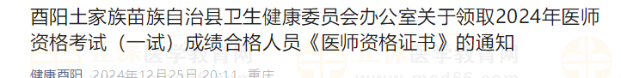 酉陽土家族苗族自治縣衛(wèi)生健康委員會辦公室關(guān)于領(lǐng)取2024年醫(yī)師資格考試(一試)成績合格人員《醫(yī)師資格證書》的通知