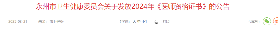 永州市衛(wèi)生健康委員會關(guān)于發(fā)放2024年《醫(yī)師資格證書》的公告