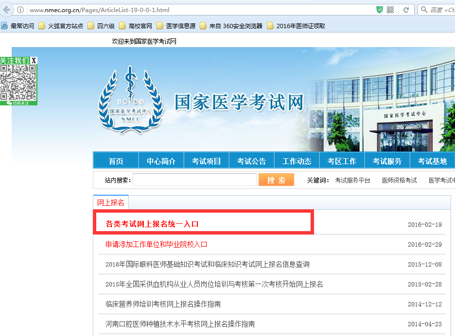 (一)登錄國(guó)家醫(yī)學(xué)考試網(wǎng)(網(wǎng)址是:http://www.nmec.org.cn/),點(diǎn)擊:“網(wǎng)上報(bào)名”;