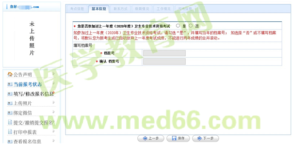點擊"確定”后,進(jìn)入選擇“是否參加過上一年度(2020年度) 衛(wèi)生專業(yè)技術(shù)資格考試”的頁面,請仔細(xì)閱讀此頁說明,新考生請選擇“否”,并點擊“下一步"進(jìn)入詳細(xì)信息填寫頁面。見下圖: