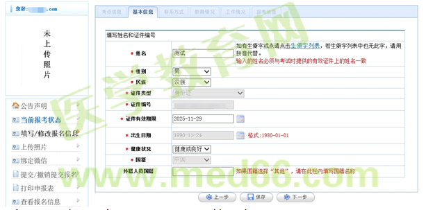 進(jìn)入基本信息的填寫頁面,內(nèi)容包括“姓名”、“性別”、“民族”、“證件有效期限”、“出生日期”、“健康狀況”、“國籍”、“外籍人員國籍”,其中的“證件類型”、“證件編號"和“國籍”置灰,表示不可以修改。見下圖: