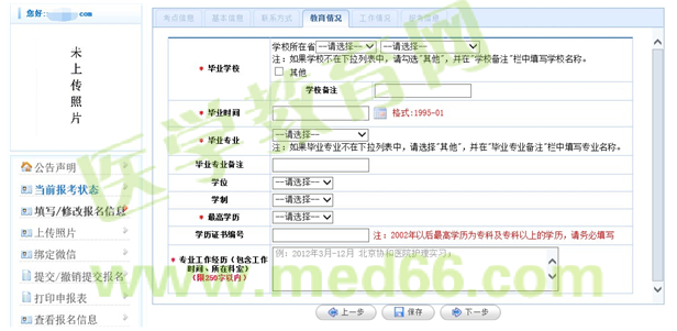 4、填寫教育情況:“畢業(yè)學(xué)?!薄ⅰ爱厴I(yè)時間”、 “畢業(yè)專業(yè)”、“畢業(yè)專業(yè)備注”、“學(xué)位”、 “學(xué)制”、 “最高學(xué)歷”、“學(xué)歷證書編號”和“專業(yè)工作經(jīng)歷”等各項內(nèi)容。見下圖: