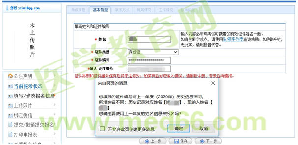 如考生確認(rèn)本人姓名沒有發(fā)生變化,僅是輸入錯誤,請點擊"確定",系統(tǒng)將直接默認(rèn)并顯示該考生上一年度報考時所填姓名,見下圖: