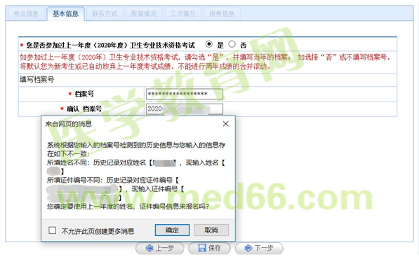 如選擇“是”,請?zhí)顚憴n案號,系統(tǒng)將提示此檔案號對應(yīng)的身份信息與考生當(dāng)前填寫的身份信息不一致,若繼續(xù)選擇“確定”,系統(tǒng)將自動默認(rèn)并顯示該考生上一年度填寫和使用的身份信息,考生將無法使用新填寫的姓名和身份證號;若選擇“取消”,表示不接受所填檔案號對應(yīng)的身份信息,考生將以新考生身份進(jìn)行報名,如考生確實參加過上一年度相同專業(yè)的考試,務(wù)必在現(xiàn)場確認(rèn)時向所在考點提出檔案號合并的申請,否則上一年度的考試成績將無法進(jìn)行合并滾動。