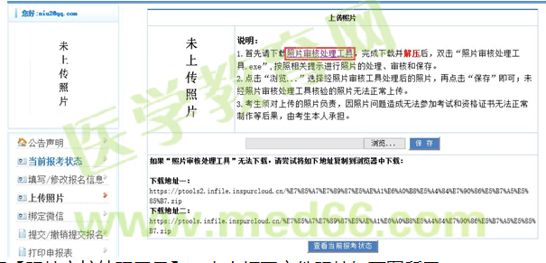 基本信息填寫并保存后,須進(jìn)行照片上傳。為確保簽到表、準(zhǔn)考證、資格證書等文件照片正常顯示,考生須首先下載【照片審核處理工具】,未經(jīng)照片審核工具核驗的照片無法正常上傳。具體操作見下圖: