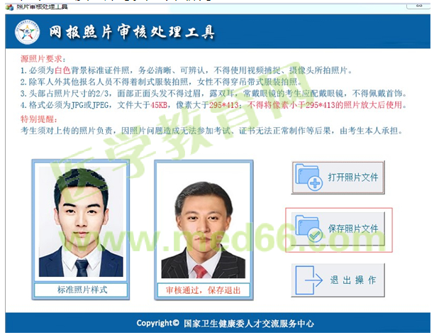 如選擇照片系統(tǒng)判定符合要求,系統(tǒng)會在審核通過照片區(qū)域顯示照片,點擊”保存照片文件”將審核通過的照片保存在本地電腦上即可,如下圖所示: