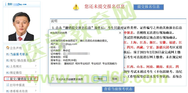 考生可以通過【提交/撤銷提交報名】功能,提交或撤銷提交個人信息。請認(rèn)真閱讀提交報名信頁面的說明,點擊“提交報名信息"按鈕,系統(tǒng)會提示報名的基本信息,檢查無誤后點擊“確定”,報名信息提交成功。如下圖: