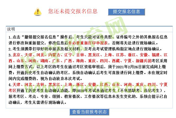 注意事項:天津、河北、吉林、黑龍江、上海、浙江、安徽、江西、山東、河南、重慶、四川、寧夏13個考區(qū)開通了歷史考生自動確認(rèn)的功能,即2020年考試未通過考生(不包括缺考、違紀(jì)考生),報考考區(qū)、考點專業(yè)、級別、教育情況、工作情況等信息沒有發(fā)生變化的,考生點擊“提交報名信息”按鈕后,系統(tǒng)會提示已自動確認(rèn),考生無需到現(xiàn)場遞交材料,也無法再進(jìn)行信息修改或者撤銷提交信息。