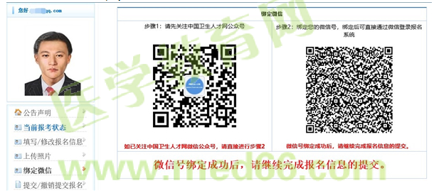 報名信息和照片保存后,考生進(jìn)入【綁定微信】功能,生按界面顯示的步驟關(guān)注中國衛(wèi)生人才網(wǎng)微信公眾號并進(jìn)行微信綁定,見下圖: