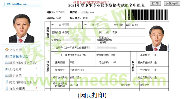 報名信息提交后,考生可以通過【打印申報表】功能打印《2021年度衛(wèi)生專業(yè)技術(shù)資格考試報名申報表》。系統(tǒng)會將報名信息以表格形式顯示,同時支持在線打印和另存為pdf文件打印。見下圖: