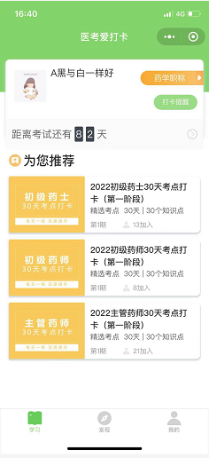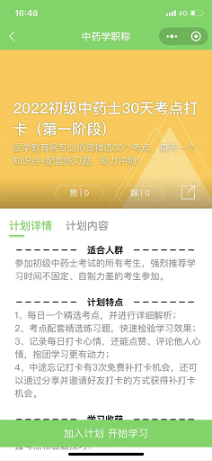 第三步:選擇“2022年初級(jí)中藥士/中藥師/主管中藥師30天考點(diǎn)打卡(第一階段)”,點(diǎn)擊下方“加入計(jì)劃開(kāi)始學(xué)習(xí)”