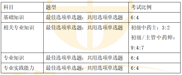 中藥學(xué)職稱(chēng)(三級(jí)別)考試科目均設(shè)置為“基礎(chǔ)知識(shí)”、“相關(guān)專(zhuān)業(yè)知識(shí)”、“專(zhuān)業(yè)知識(shí)”、“專(zhuān)業(yè)實(shí)踐能力”等4個(gè)科目。
