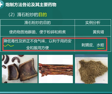 滑石粉炒目的之一:降低毒性及矯正不良?xì)馕叮岳谟盟幇踩头梅奖?,如刺猬皮、水蛭等?/p>