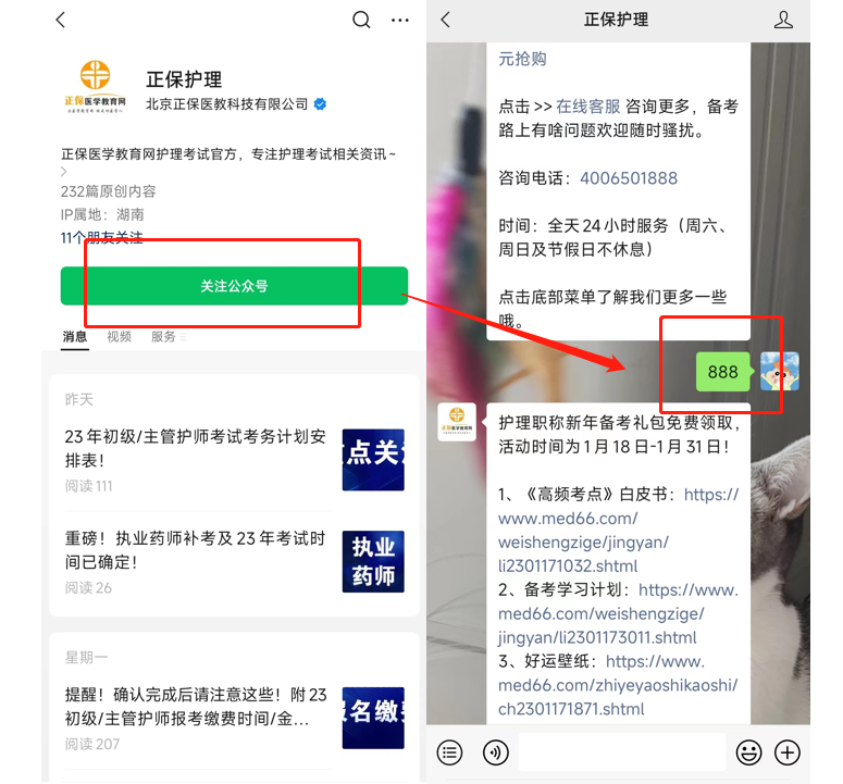 步驟一:掃描上方海報(bào)上的二維碼,關(guān)注“正保醫(yī)學(xué)教育網(wǎng)衛(wèi)生職稱(chēng)”微信公眾號(hào)。已關(guān)注用戶(hù)直接回復(fù)關(guān)鍵詞:888;