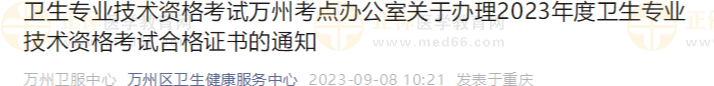 萬州考點辦公室定于2023年9月11日至9月22日辦理2023年度衛(wèi)生專業(yè)技術(shù)資格考試合格證書?,F(xiàn)將辦證相關事項通知如下: