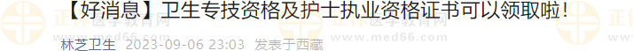 在林芝考點參加2023年度衛(wèi)生專業(yè)技術資格及護士執(zhí)業(yè)資格考試,并通過國家分數(shù)線(護士執(zhí)業(yè)資格考試:各科目合格標準均為300分;衛(wèi)生專業(yè)技術資格考試:各科目合格標準均為60分)合格的考生。