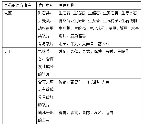 中藥的處方腳注是指醫(yī)師開(kāi)湯劑處方時(shí)在某味藥的上角或下角處所加的簡(jiǎn)要要求。常見(jiàn)的腳注術(shù)語(yǔ)有先煎、后下、包煎、另煎、沖服、烊化、打碎、炒制等。