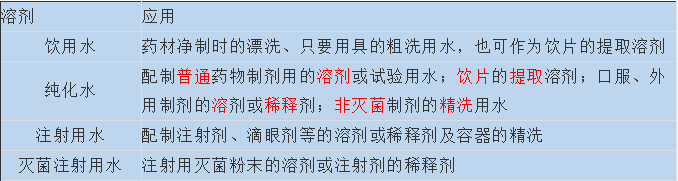 解讀:較難記憶的是純化水,純化水的應(yīng)用抓關(guān)鍵詞:普通溶劑、飲片提取、口外溶稀釋、非滅菌精洗。飲用水關(guān)鍵詞:漂洗、粗洗。注射用水除了應(yīng)用于注射劑外,還可用于滴眼劑。