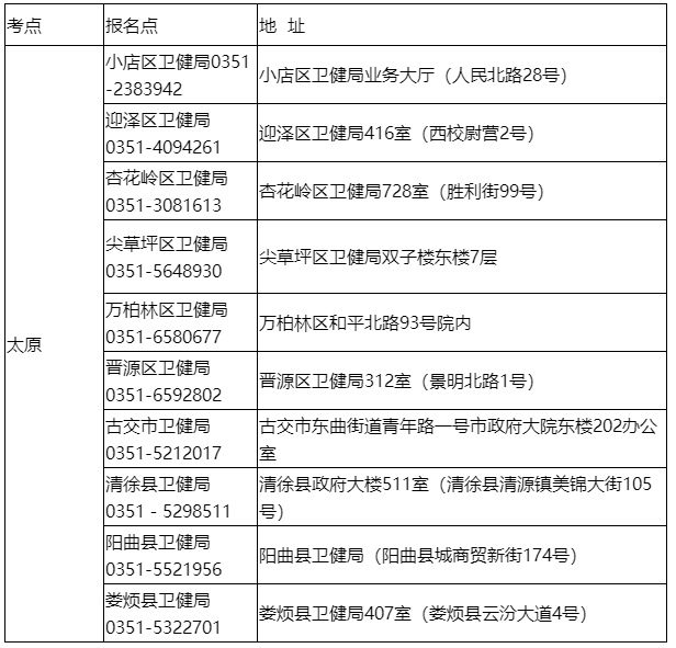(一)太原考點(diǎn):太原市衛(wèi)生健康委員會(huì)(太原市住房公積金管理中心萬(wàn)柏林分理處303室)