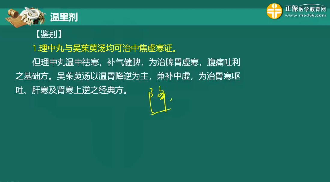 但理中丸溫中祛寒,補氣健脾,為治脾胃虛寒,腹痛吐利之基礎方。吳茱萸湯以溫胃降逆為主,兼補中虛,為治胃寒嘔吐、肝寒及腎寒上逆之經典方。