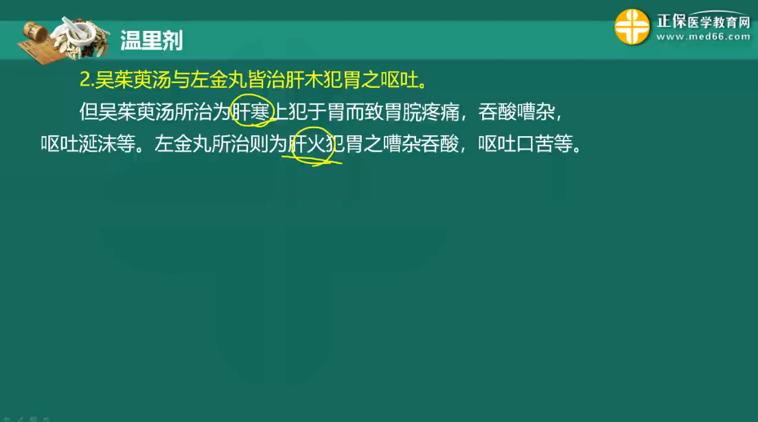 但吳茱萸湯所治為肝寒上犯于胃而致胃脘疼痛,吞酸嘈雜,嘔吐涎沫等。左金丸所治則為肝火犯胃之嘈雜吞酸,嘔吐口苦等。