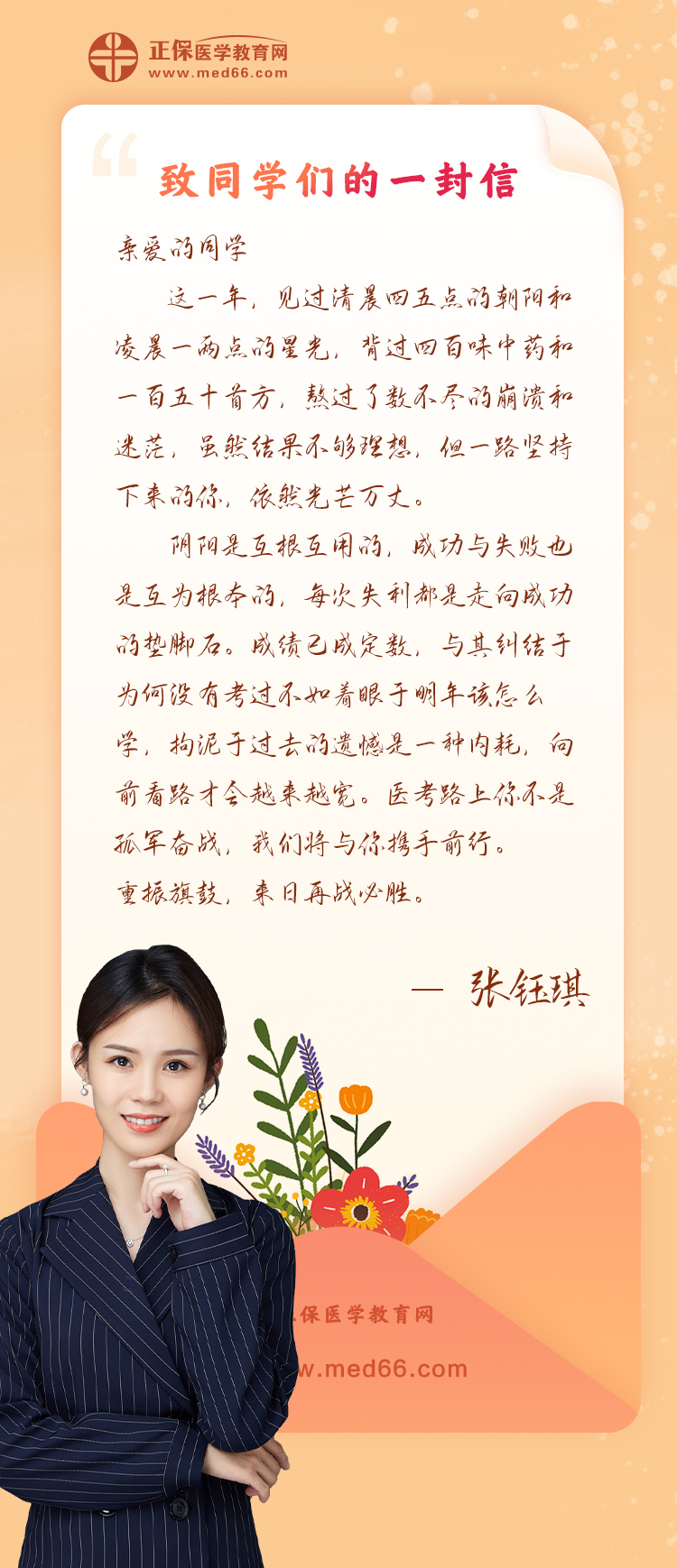 2023年中醫(yī)內科主治醫(yī)師考試成績查詢入口開通(快速查分>>)后,網校收到了眾多考生的喜報,消息的窗口一個個地從手機上彈出來,微信語音電話、視頻電話也響個不停,隔著屏幕都能感受到的喜悅,祝所有考生都考出好成績!除了分享成功過關的喜悅外,還有對網校、老師、服務團隊等數不盡的感謝!此時除了通過考試開心的考生們,醫(yī)學教育網老師們也在心心念念著各位同學,各位老師紛紛為大家送上了“致同學們的一封信”,快來看看張鈺琪老師都對我們說了哪些內容: