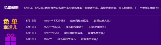 活動(dòng)期間每天在購課學(xué)員中隨機(jī)抽取一名幸運(yùn)學(xué)員贏取免單大獎(jiǎng),心動(dòng)就快來吧!