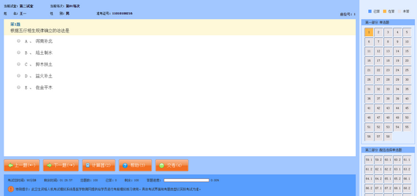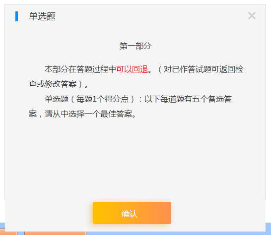 人機(jī)對話考試是考生在計(jì)算機(jī)屏幕上閱讀試題,并通過鼠標(biāo)和鍵盤操作完成作答。人機(jī)對話考試并非考計(jì)算機(jī)知識或操作能力,而是測試形式的一種轉(zhuǎn)變,其測試目標(biāo)仍然是考生的專業(yè)知識掌握情況和實(shí)際應(yīng)用能力。人機(jī)對話考試與紙筆作答最大的特點(diǎn)就是題型之間操作不可逆,例如在“基礎(chǔ)知識”考試中,一旦確認(rèn)完成作答、進(jìn)入新的題型時(shí)(如結(jié)束“單選題”,進(jìn)入“共用選項(xiàng)單選題”),考生將不能退回到前一測試題型(“單選題”)進(jìn)行查看和修改答案。