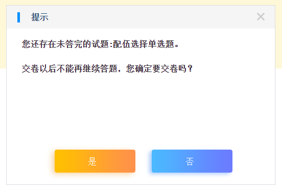 彈出提示,點(diǎn)擊交卷完成考試。(考生們要答完題再交卷哦?。?/p>