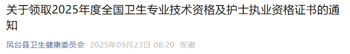 參加2025年全國衛(wèi)生專業(yè)技術(shù)資格考試及護(hù)士執(zhí)業(yè)資格考試且成績合格的鳳臺縣考生,自2025年9月23日起可領(lǐng)取衛(wèi)生專業(yè)技術(shù)資格及護(hù)士執(zhí)業(yè)資格證書?,F(xiàn)將證書領(lǐng)取事宜通知如下: