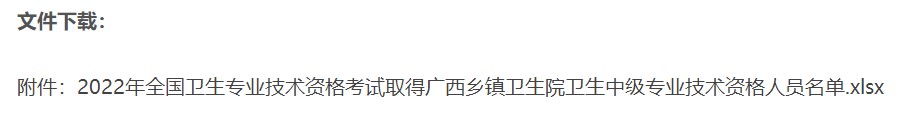 根據(jù)《自治區(qū)衛(wèi)生計生委自治區(qū)人力資源和社會保障廳關(guān)于劃定全國衛(wèi)生專業(yè)技術(shù)資格考試廣西區(qū)內(nèi)合格分數(shù)線及有關(guān)問題的通知》(桂衛(wèi)人發(fā)〔2018〕45號)精神,經(jīng)核準,2022年全國衛(wèi)生專業(yè)技術(shù)資格考試共有939人取得廣西鄉(xiāng)鎮(zhèn)衛(wèi)生院衛(wèi)生中級專業(yè)技術(shù)資格,人員名單經(jīng)公示無異議,現(xiàn)予公布。