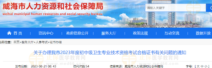 詳情威海市人力資源和社會保障局發(fā)布關(guān)于辦理我市2023年度初中級衛(wèi)生專業(yè)技術(shù)資格考試合格證書有關(guān)問題的通知,醫(yī)學(xué)教育網(wǎng)整理具體內(nèi)容如下: