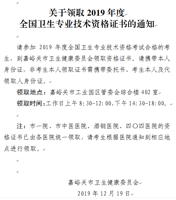 甘肅嘉峪關2019中醫(yī)全科主治資格證書領取通知
