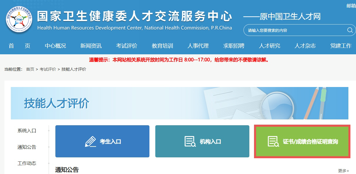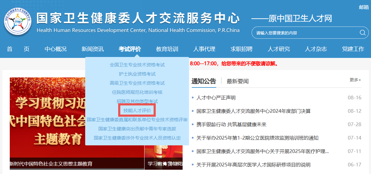 第一步:登錄中國衛(wèi)生人才網(wǎng):https://www.21wecan.com/ 找到“考試評價”-“技能人才評價”。