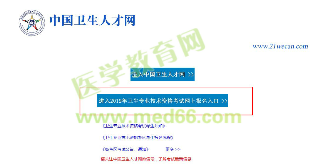 2019年衛(wèi)生專業(yè)技術(shù)資格考試報名入口: http://www.21wecan.com/