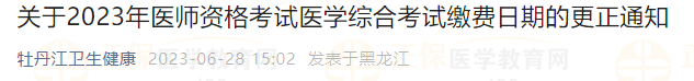牡丹江考點2023年中醫(yī)執(zhí)業(yè)醫(yī)師資格考試醫(yī)學綜合考試繳費日期的更正通知