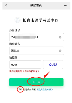 2、輸入身份證號、姓名、驗證碼,勾選下方《用戶隱私政策》,點擊“下一步”。如下圖。(他人代繳,請輸入?yún)⒓涌荚嚨目忌救诵畔?/span>)