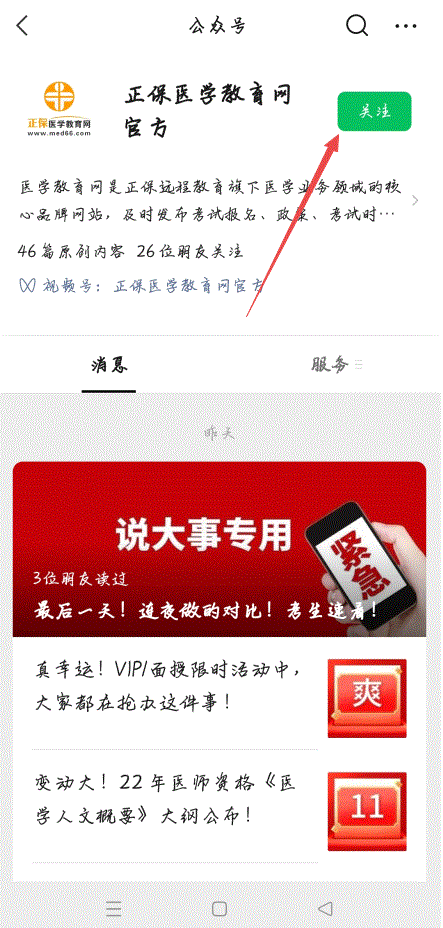 第二步:未關(guān)注“正保醫(yī)學(xué)教育網(wǎng)官方”的同學(xué)點(diǎn)擊“關(guān)注”;
