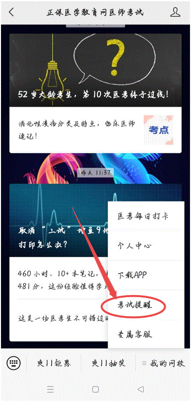 第三步:已關(guān)注微信公眾號(hào)的同學(xué),選擇「我的網(wǎng)?!?「考試提醒」;