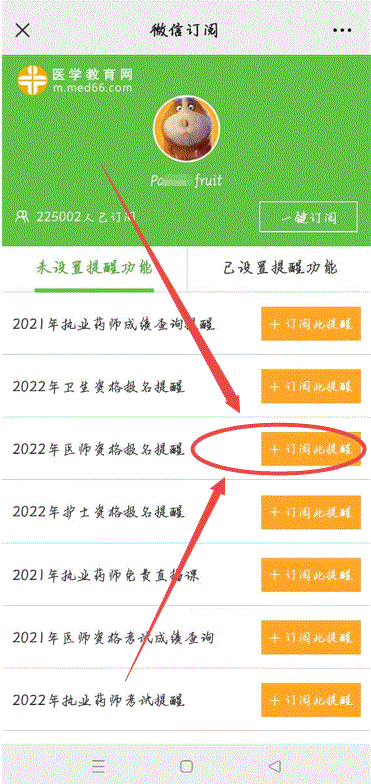 第四步:點(diǎn)擊"2022年醫(yī)師資格考試報(bào)名"提醒功能,點(diǎn)擊“訂閱此提醒”即可完成訂閱;