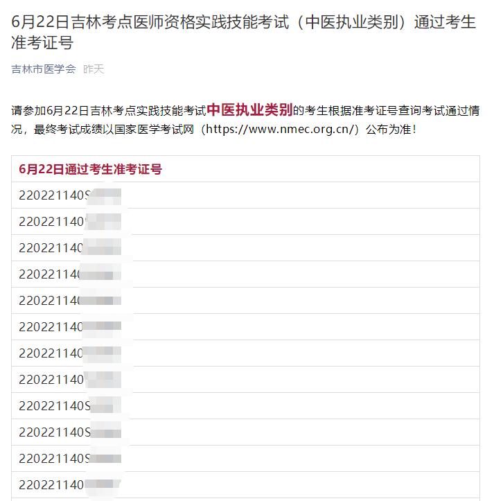 請參加6月22日吉林考點實踐技能考試中醫(yī)執(zhí)業(yè)類別的考生根據(jù)準考證號查詢考試通過情況,最終考試成績以國家醫(yī)學考試網(wǎng)(https://www.nmec.org.cn/)公布為準!