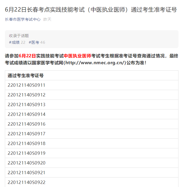 請參加6月22日實(shí)踐技能考試中醫(yī)執(zhí)業(yè)醫(yī)師考試考生根據(jù)準(zhǔn)考證號(hào)查詢通過情況,最終考試成績請以國家醫(yī)學(xué)考試網(wǎng)(http://www.nmec.org.cn/)公布為準(zhǔn)!