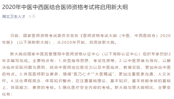 日前,國家醫(yī)師資格考試委員會(huì)發(fā)布《醫(yī)師資格考試大綱(中醫(yī)、中西醫(yī)結(jié)合)2020年版》(以下簡稱新大綱),從2020年開始,啟用該新大綱。